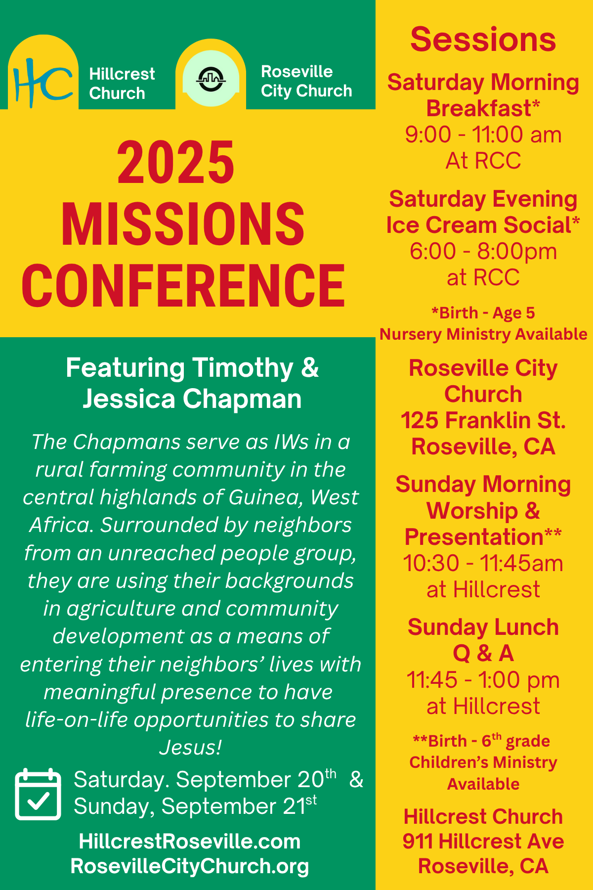 SATURDAY, SEPTEMBER 20th Event 1: Breakfast at Roseville City Church (125 Franklin St, Roseville) 9:00-11:00am (Nursey Ministry is provided Birth – Age 5, older children are invited to join with the adults to listen to the missionaries) Event 2: Ice Cream Social at Roseville City Church (125 Franklin St., Roseville) 6:00-8:00pm  (Nursey Ministry is provided Birth – Age 5, older children are invited to join with the adults to listen to the missionaries)